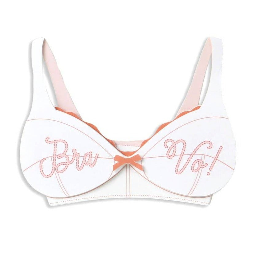 Hook the bra clasps together for standing display in this paper-engineered pop-up greeting card. Featuring envelope printed to mimic a lingerie box. Front greeting: bra vo! Inside greeting: none.