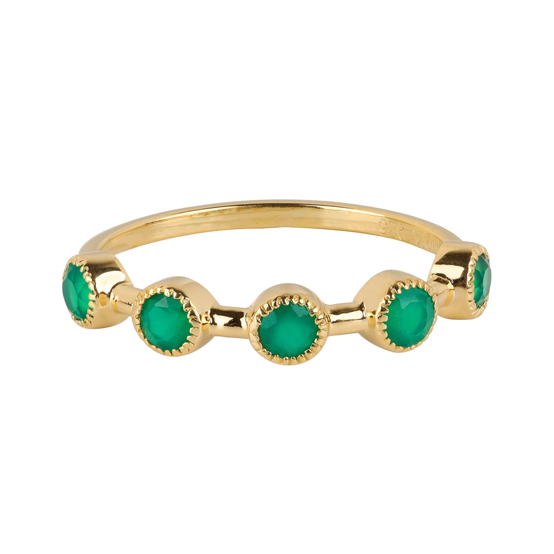 Crafted in gleaming gold, this delicate band features five round-cut green onyx gemstones, each cradled in a textured bezel setting that adds richness and dimension. The evenly spaced stones create a gentle rhythm across the ring—like leaves rustling in an elegant breeze or echoes of emerald light trailing through the air.